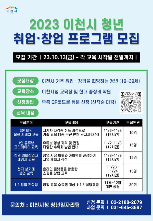 [금요저널] 이천시는 다양한 취·창업 교육을 통해 이천시에 거주하고 있는 청년들의 취업과 창업을 지원하는 ‘이천시 청년 취·창업 지원프로그램'의 수강생을 모집 중에 있다고 밝혔다.