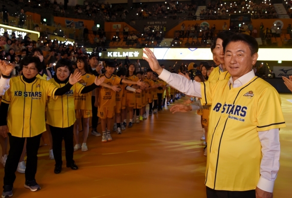 김동근 시장은 “2023-2024 시즌 KB손해보험 스타즈 배구단의 열정 넘치는 경기를 기대하며 좋은 성적 거두기를 응원한다”며 시구로 화려한 개막전의 시작을 알렸다.