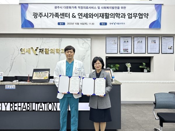 연세와이재활의학과에서 진행된 협약식에는 광주시 가족센터 오영희 센터장과 연세와이재활의학과 김형빈 대표원장 등 임직원이 참석했다.