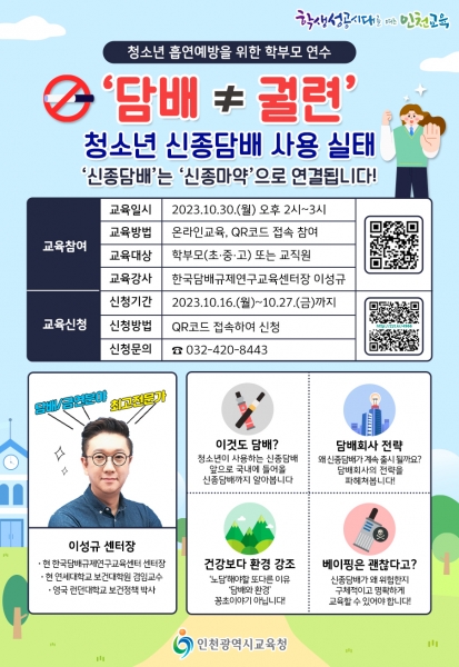 [금요저널] 인천광역시교육청은 가정 내 청소년 흡연 예방 교육을 지원하기 위해 온라인 학부모 연수를 30일 실시한다.