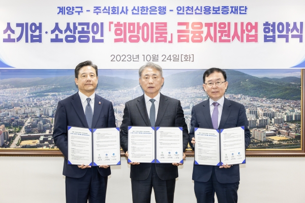 계양구는 24일 신한은행, 인천신용보증재단과 함께 “소기업·소상공인을 위한 희망이룸 금융지원사업” 협약을 체결하고 상호협력하기로 했다.