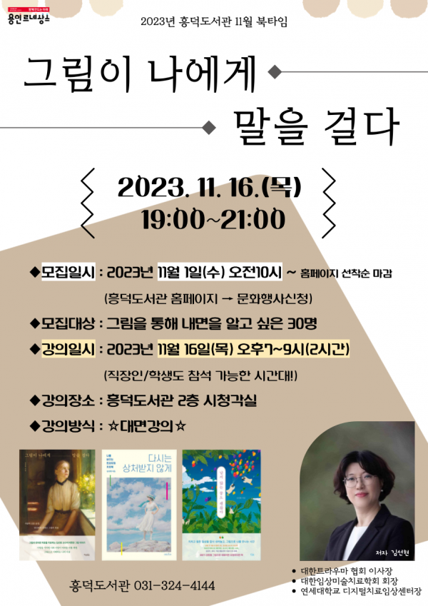 [금요저널] 용인특례시 흥덕도서관은 11월 북타임 프로그램으로 미술치료 전문가 김선현 교수를 초청해 ‘그림이 나에게 말을 걸다’란 제목으로 강연을 진행한다고 26일 밝혔다.