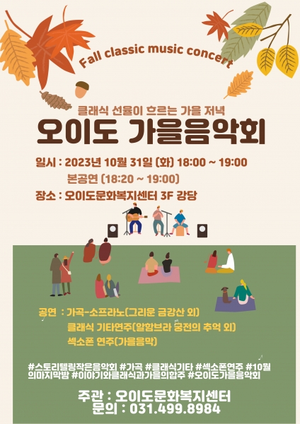 오이도문화복지센터 관계자는 “가을의 절정인 10월의 마지막 날 아름다운 음악과 함께 좋은 추억을 남길 수 있기를 바란다”며 “앞으로도 주민들을 위한 다양한 문화예술행사를 마련할 것”이라고 말했다.