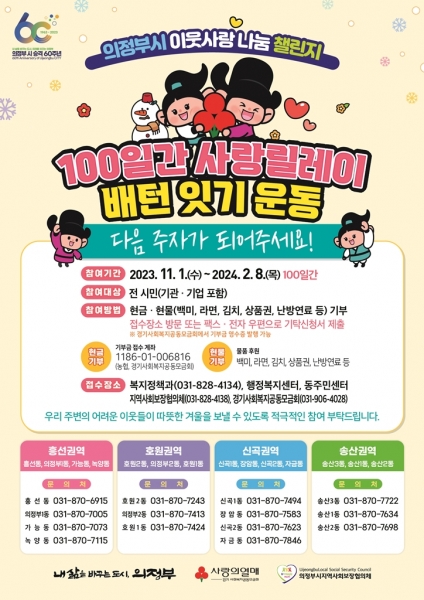 100일간 사랑릴레이 배턴 잇기는 의정부시 자체 행사로 설 명절 전 100일 동안 시민들의 자발적인 후원 참여를 이끌어내고자 마련됐다.