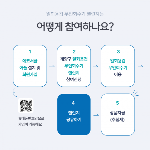 챌린지는 오는 31일까지 진행되며 스마트폰 앱 ‘에코서클’에서 ‘계양구 일회용컵 무인회수기 챌린지’에 참여신청 후 계산2동 행정복지센터 또는 계산체육공원에 설치된 스마트 일회용컵 무인회수기를 이용하고 공유하면 자동 응모된다.