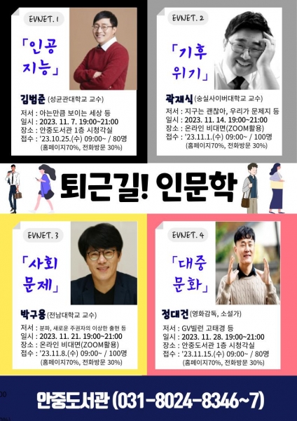 ‘퇴근길 인문학’은 모두 사전접수가 가능하며 현재 김범준 교수의 ‘인공지능’ 강연이 접수 중이다.