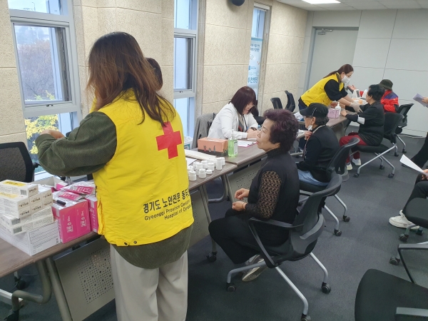 의료 취약계층을 위해 찾아가는 이동병원 3자 협약을 체결한 소요동과 경기도립노인전문 동두천병원, 소요동 지역사회보장협의체는 이날 재가 어르신, 경로당, 프로그램 이용 어르신 등 당초 예정 인원을 초과한 60명을 대상으로 혈압·혈당 측정, 내과 전문의 진료, 약 처방·조제 등 무료 건강검진사업을 펼쳤다.