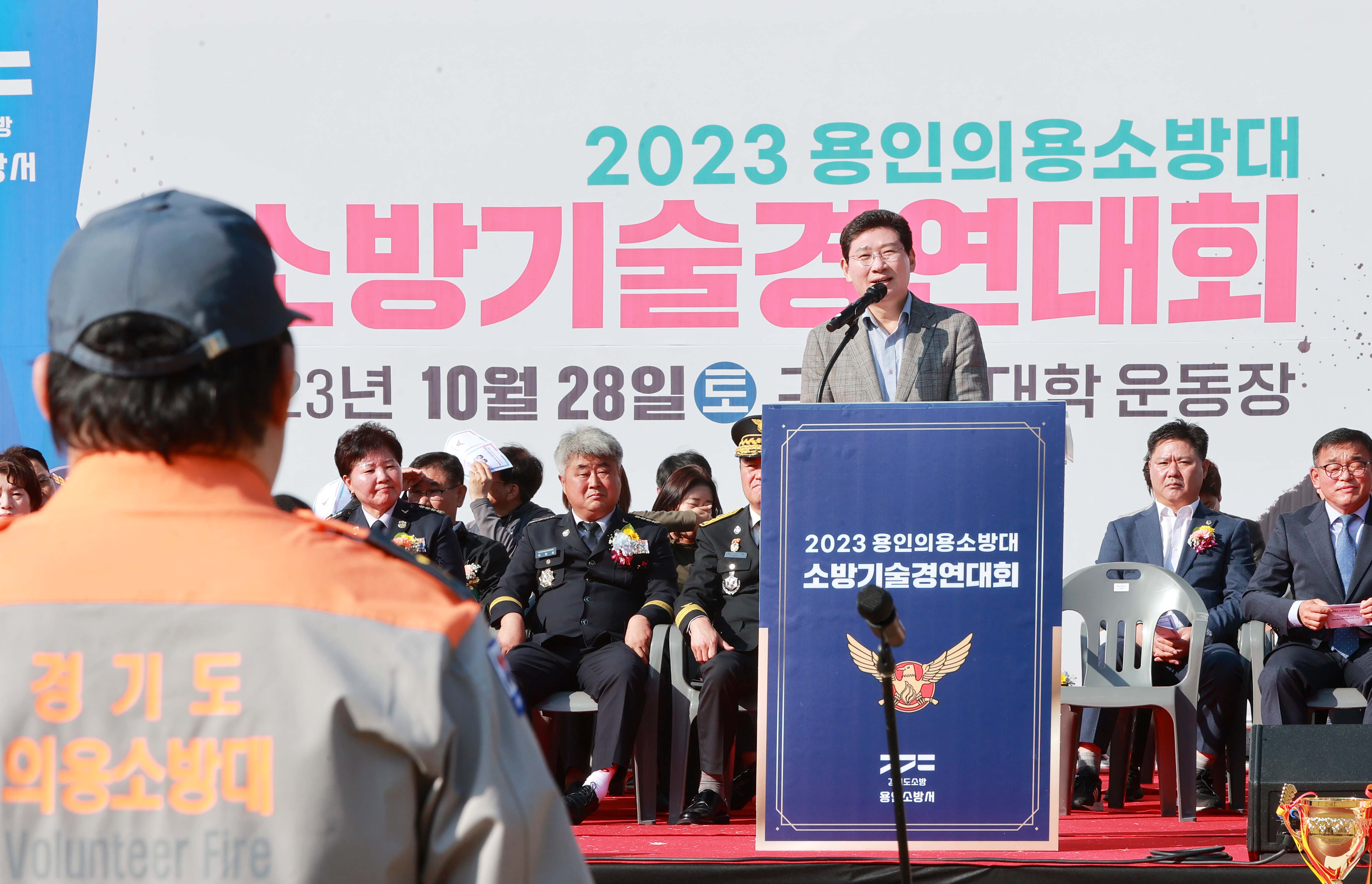 이상일 용인특례시장이 28일 기흥구 언남동 (구)경찰대학교 운동장에서 열린 ‘2023년 용인의용소방대 소방기술경연대회’에 참석해 소방 가족들을 응원했다.