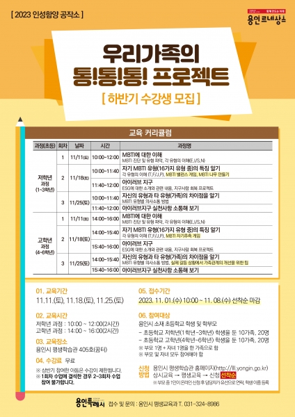 [금요저널] 용인특례시가 초등학생 자녀가 있는 가정 구성원이 모두 참여할 수 있는 가족 인성교육 프로그램 ‘우리가족의 통통통 프로젝트’를 진행한다고 30일 밝혔다.
