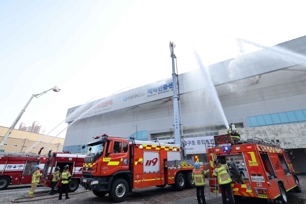 구는 다중이용시설의 복합재난 상황을 대비하기 위해 송림체육관을 훈련장소로 선정했다.