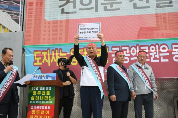 동두천시 지역발전 범시민대책위원회는 10월 24일 경기도청 수원 광교 신청사 앞에서 경기 동북부권 공공의료원 유치 동두천시민 총궐기대회를 열었다.