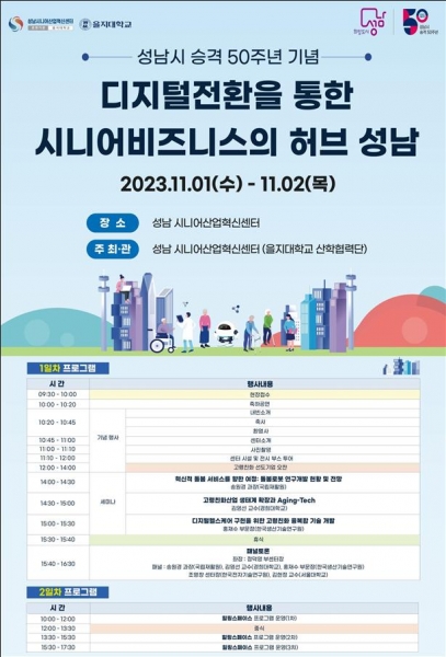 [금요저널] 성남시는 시 승격 50주년을 맞이해 11월 1일부터 2일까지 양일간 ‘디지털전환을 통한 시니어 비즈니스의 허브 성남’ 포럼을 성남 시니어산업혁신센터에서 개최한다.
