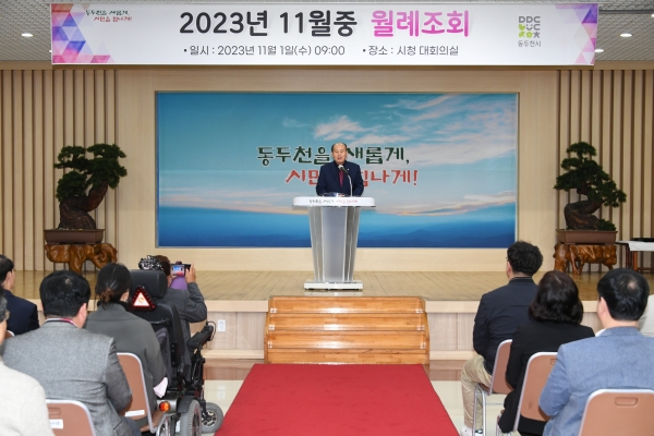 이날, 월례조회는 ‘제35회 동두천시 시민대상’에서 문화예술부문 대상을 수상한 김민호 명예시장과 전 직원이 참석한 가운데 개최됐다.