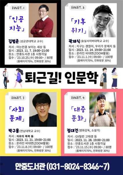 [금요저널] 평택시립안중도서관은 11월에 야간 인문학 프로그램인 ‘퇴근길 인문학’을 운영할 예정이다.