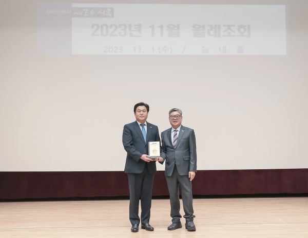 [금요저널] 시흥시는 지난 1일 시청 늠내홀에서 열린 11월 월례조회에서 경기도지체장애인협회로부터 ‘장애공감도시 인증패’를 전달받았다.