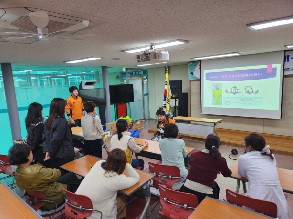 이에 생물테러 초동대응요원의 현장 대응 능력을 강화하기 위해 생물테러 대응 초동조치 교육 개인보호구 착·탈의 훈련 독소 다중 탐지키트 활용 및 검체 이송 등 보건 역할 중심의 실습형 훈련을 진행했다.