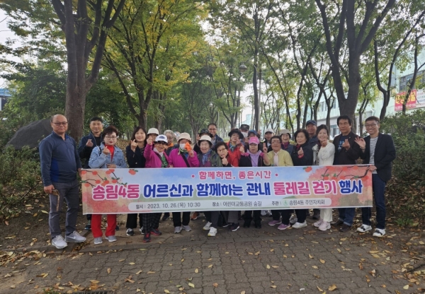 송림4동 주민자치회와 센터 직원들은 둘레길 걷기에 참여한 15명의 어르신들과 동행하며 안전하게 산책을 마무리했다.