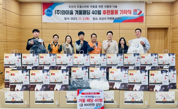 [금요저널] 오산시는 지난 2일 오산시 가장로에 위치한 전자부품 제조업체 와이솔 임직원 일동이 오산시자원봉사센터를 방문, 오산시 드림스타트 아동들을 위해 패딩 40벌을 기탁했다.