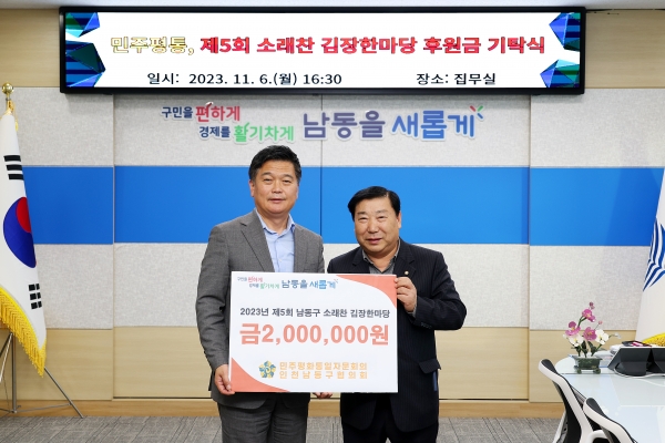[금요저널] 인천시 남동구는 최근 구청장 집무실에서 민주평화통일자문회의 인천남동구협의회로부터 ‘제5회 남동구 소래찬 김장한마당’ 후원금 200만원을 전달받았다고 7일 밝혔다.