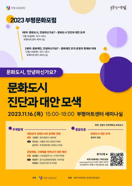 [금요저널] 부평구 문화재단이 오는 16일 오후 3시 부평아트센터에서 ‘문화도시, 안녕하신가요?’란 주제로 ‘부평문화포럼’을 개최한다.