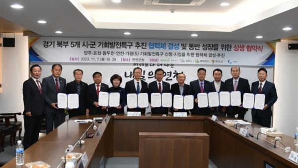 [금요저널] 동두천시는 7일 연천군청에서 경기 북부 5개 시·군을 대표하는 단체장, 시군 의장 및 지역구 국회의원이 참석한 가운데 ‘경기 북부 5개 시군 기회발전특구 추진 협력체 결성 및 동반 성장을 위한 상생 협약’을 체결했다.