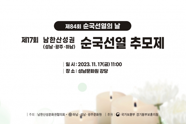[금요저널] 남한산성문화권협의회는 11월 17일 제84회 순국선열의 날을 맞이해, 국권회복을 위해 헌신하신 순국선열의 독립정신과 희생정신을 후세에 길이 전하고 선열의 얼과 위훈을 기리고자, ‘제17회 남한산성권 순국선열 추모제’를 경기동부보훈지청 후원으로 11.17 오전11시 성남문화원 강당에서 개최한다.