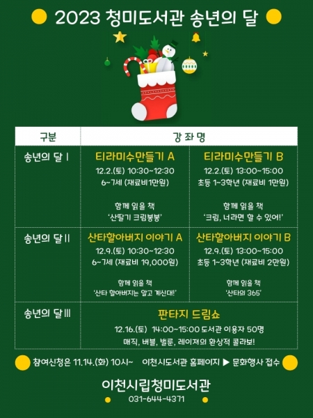 [금요저널] 이천시 청미도서관은 12월 한 달간 지역주민 참여문화 활동으로 ‘송년의 달’ 행사를 운영한다.