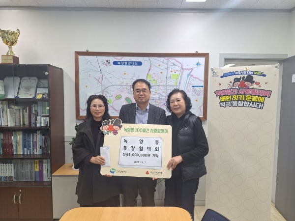 [금요저널] 의정부시 녹양동주민센터는 11월 7일 녹양동 통장협의회가 ‘100일간 사랑릴레이 배턴 잇기’ 운동에 동참하고자 생활이 어려운 주민에게 전달해 달라며 성금 100만원을 기탁했다고 밝혔다.