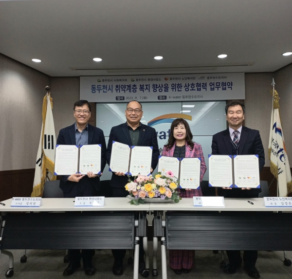 [금요저널] 동두천시는 노인복지관 및 한국수자원공사 동두천 수도지사와 지난 7일 관내 취약계층 복지 향상을 위한 상호협력 MOU를 체결했다고 밝혔다.