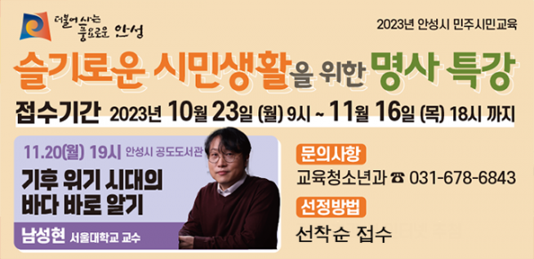 [금요저널] 안성시는 민주시민교육 명사 특강을 오는 11월 20일 오후 7시 공도도서관에서 개최한다.