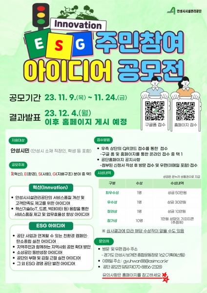 [금요저널] 안성시시설관리공단은 오는 11월 24일까지 시민의 참신하고 혁신아이디어를 발굴해 경영혁신을 도모하고 지역사회 문제 해결에 동참하고자‘ESG경영 주민참여 혁신아이디어 공모전’을 개최한다고 밝혔다.