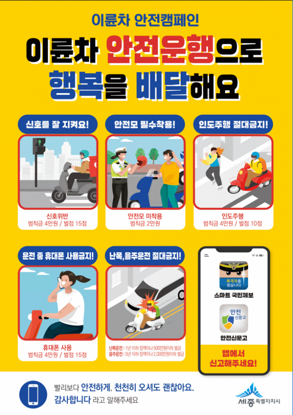 조수창 시민안전실장은 “더 안전한 세종을 위해 특별히 이륜차 운전자에게 빠른 배달보다 안전한 배달을 당부드리고 세종시민에게는 안전신고에 동참해 주실 것을 부탁드린다“고 밝혔다.