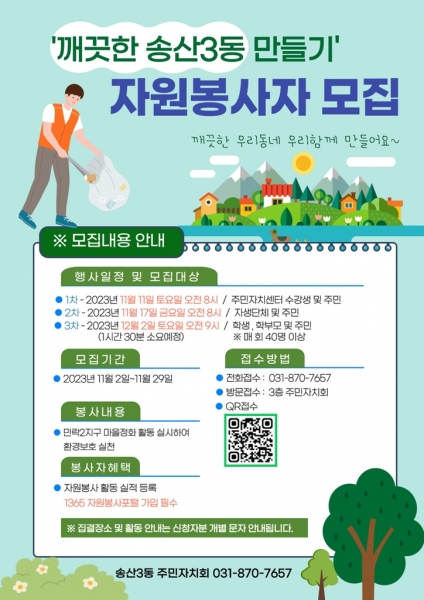 [금요저널] 의정부시 송산3동행정복지센터는 송산3동 주민자치회가 11월 29일까지 2023년 주민자치사업 ‘깨끗한 송산3동 만들기’에 참가할 자원봉사자를 모집한다고 밝혔다.