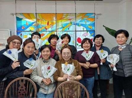 [금요저널] 관고동평생학습센터는 관고로 카페학습여행 프로그램으로 스테인드 글라스 체험을 지난 9일 우리동네 카페 페르마따에서 진행했다.