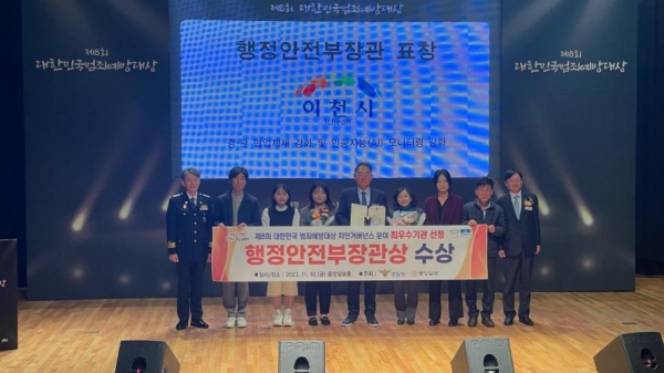 [금요저널] 이천시는 11월 10일 서울특별시 마포구 중앙일보홀에서 개최된 ‘제8회 대한민국 범죄예방대상’에서 치안거버넌스 분야에 최우수기관으로 선정되어 행정안전부장관 표창을 수상했다.