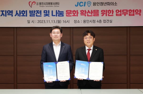 [금요저널] 용인시자원봉사센터는 13일 JCI 용인청년회의소와 지역사회 나눔문화 확산을 위한 업무협약을 체결했다고 밝혔다.