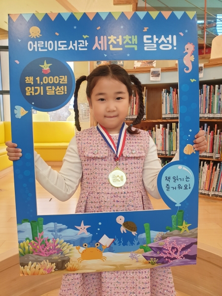장선우 어린이는 11월 7일 어린이도서관에 방문해 세천책 달성 인증서와 메달을 받았다.