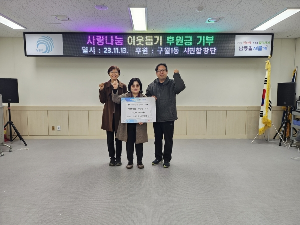 이번 후원금은 구월1동 시민합창단이 지난 10월 열린 제14회 전국 주민자치센터 프로그램 경연대회에서 최우수상을 수상하며 받은 포상금으로 저소득 및 복지 사각지대 계층을 위한 사업에 쓰일 예정이다.