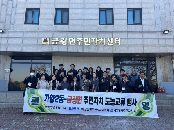 이번 협약체결 뿐만아니라 교류행사의 시작으로 강서구 가양2동 주민자치 회원 25명이 함께 참석해 금광면 주민자치 프로그램 현황 설명과 함께 금년도 새롭게 단장한 금광면 주민자치센터를 관람했으며 안성유기체험, 블루베리쨈 만들기 체험, 금광호수 둘레길 관람 등 체험행사를 병행 추진했다.