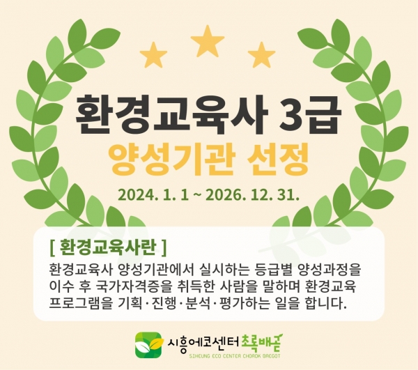 [금요저널] 시흥시는 시흥에코센터가 지난 13일 환경부 장관이 지정하는 ‘2023년 환경교육사 3급 양성기관’에 최종 선정됐다고 밝혔다.