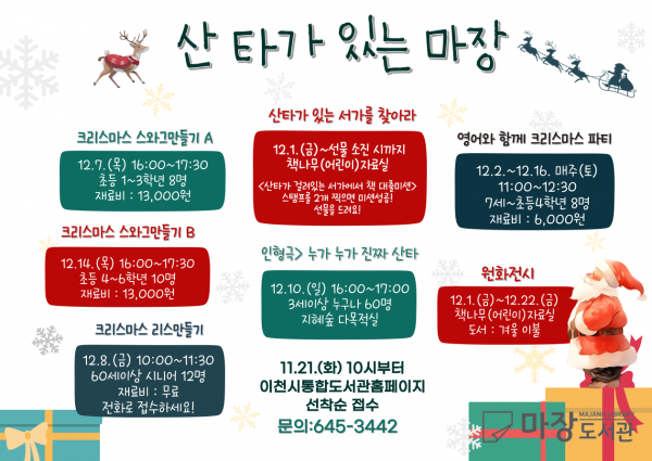 [금요저널] 이천시 마장도서관은 송년의 달 12월을 맞이해 12월 1일부터 한 달간 이천시민을 대상으로 송년의 달 프로그램 ‘산타가 있는 마장’을 운영한다.