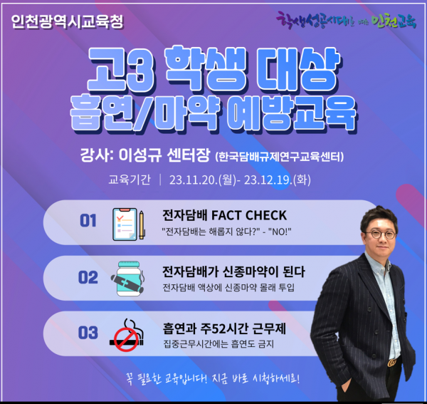 인천광역시교육청, 수능 이후 고3 학생 대상 흡연·마약예방 집중 연수 지원