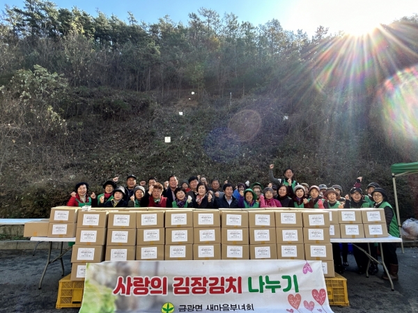 안효순 부녀회장은 “전달된 김장김치가 관내 어르신 등 이웃들의 월동준비에 조금이나마 보탬이 되기를 바란다”며 “바쁜 와중에도 함께해주신 부녀회 회원 모두에게 감사드리고 앞으로도 지역 어르신에 대한 공경의 마음과 이웃 사랑을 실천하는 금광면 새마을부녀회가 되겠다고”고 전했다.