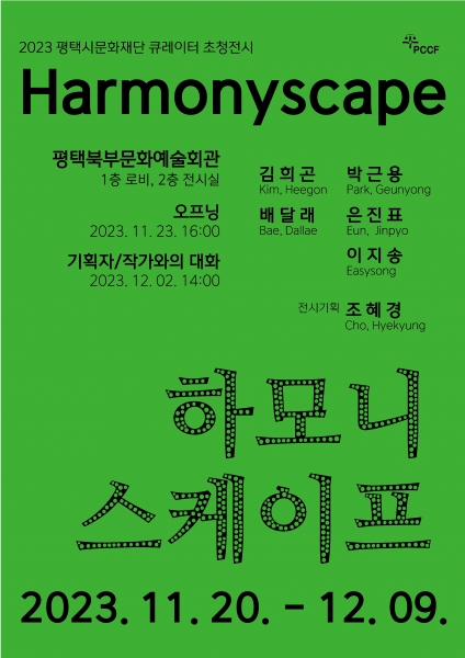 [금요저널] 평택시문화재단은 오는 11월 20일 월요일부터 12월 9일 토요일까지 큐레이터 초청전 ‘하모니스케이프 Harmonyscape’를 북부문화예술회관 전시실에서 개최한다고 밝혔다.