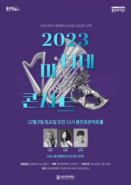 ‘2023 마티네콘서트’ 12월 공연 관련 상세내용 안내와 티켓 예매는 용인문화재단 홈페이지 또는 인터파크 티켓, CS센터 문의로 가능하다.