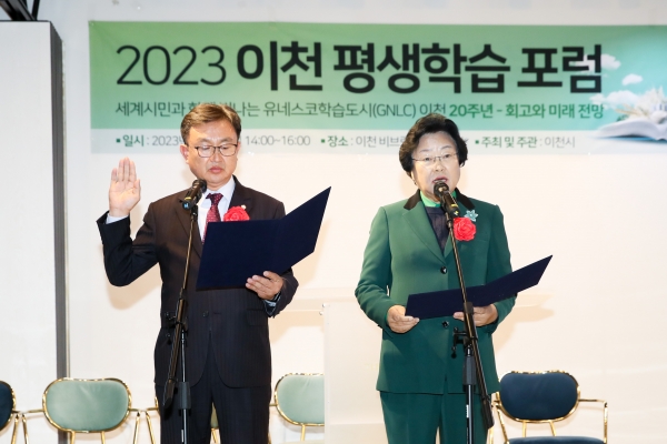 지속가능 글로벌 미래학습도시 2023선언은 주민이 주인되는 학습도시 이천 이음의 공동체 학습도시 이천 융합의 네트워크 학습도시 이천 지역문화 산실 학습도시 이천 포용과 상생의 학습도시 이천 세계시민들의 공유학습도시 이천 글로벌 지속가능 학습도시 이천의 일곱가지 실천강령을 선언했다.