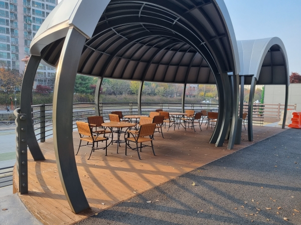 연면적 21㎡ 규모에 조성된 쉼터에는 음수대와 테이블, 의자 등이 마련돼 이곳을 오가는 시민들이 잠시나마 여유를 누리도록 했다.