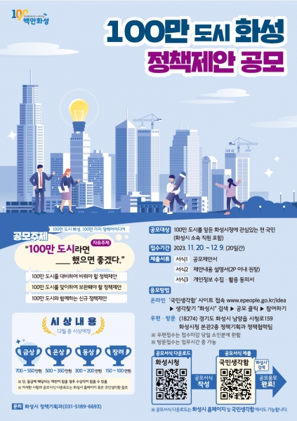 이번 공모는 화성시 인구가 올 연말 100만명을 돌파할 것으로 예상됨에 따라, 100만 도시에 걸맞은 창의적인 정책 아이디어를 발굴하기 위함으로 20일부터 12월 9일까지 20일간 진행된다.