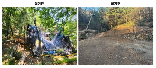 해당 시설물은 개발제한구역 내 원적산 등산로에 불법 건축된 것으로 규모는 2동 총 400㎡에 달해 그동안 도시미관 저해뿐만 아니라 원적산 내 등산로를 이용하는 구민들에게 큰 불편을 준 곳이다.