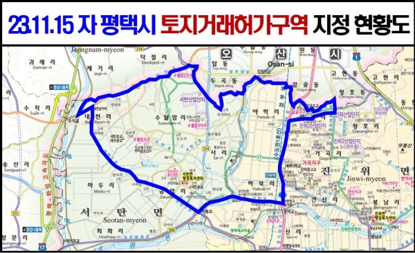 [금요저널] 국토교통부는 평택시 진위면 및 서탄면 일원을 2023년 11월 20일부터 2028년 11월 19일까지 5년간 토지거래허가구역으로 지정했다.